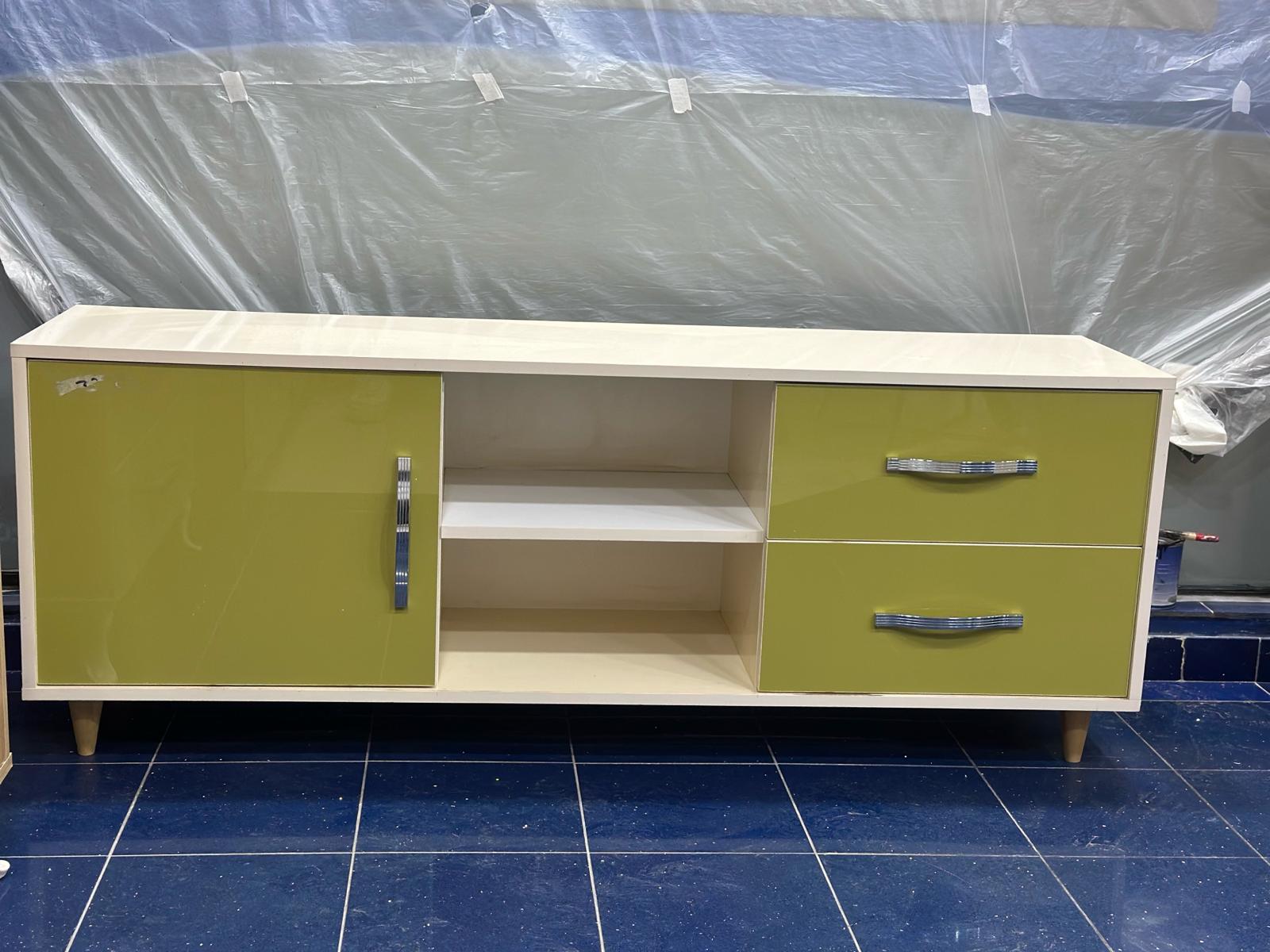 Unser klassischer Fernsehschrank in Grün bietet zeitloses Design und praktische Funktionalität mit zwei Schubladen, zwei Ablageflächen und einem geräumigen Schrank für optimale Organisation im Wohnzimmer.
